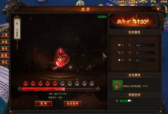 血灵系统是目前游戏中唯一的可成长瞬回生命的功能,玩家通过日常活动、挂机刷怪来获得血符养成血灵功能。血灵功能等级的提升,除了会带来大量的属性加成以外,还会获得一个血量瞬间恢复的效果(主动操作,快捷键W),这个效果是目前阴阳道游戏中恢复效果最好,的恢复效果且,可以使玩家在战斗中由逆势瞬间扭转。