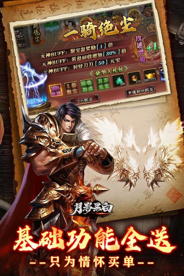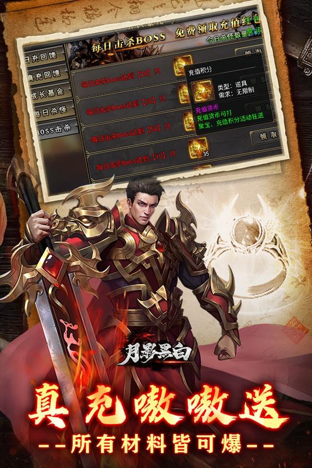 《月影黑白》是一款以传奇为题材的角色扮演手游。上线送自动回收拾取!七日登录,福利礼包,充值红包更有豪华福利待您探索!打怪就可以爆真充,时间等于一切!每日打怪在线就赠送充值积分,无需花一毛钱!首充、特权玩家可获取大量权限,快人一步!零氪通关,散人称王,真充嗷嗷送,散人也能逆袭当大佬!玩法简单直接,绝不内耗玩家!