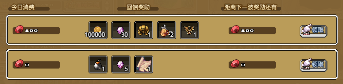 6、单日消费满 100血钻,即可获得:金币×100000,荣誉碎片×30,巨魔雕像×1,冒险徽章×1,神力矿工包×2