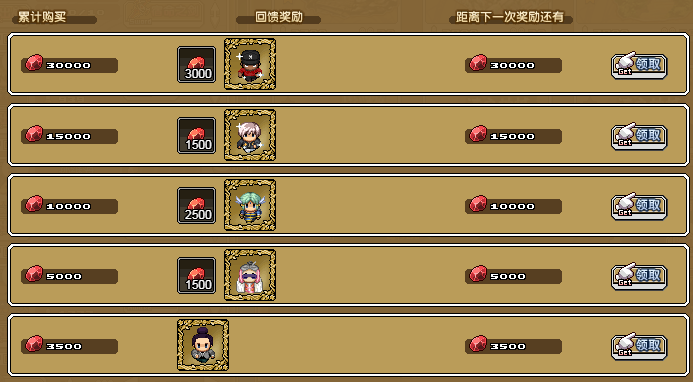 5、单日消费满500血钻,即可获得:金币×300000,荣誉碎片×100,三国英雄礼包×1,冒险徽章×1,神力矿工包×2