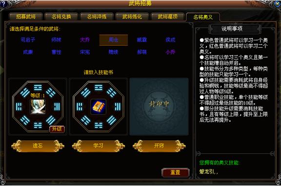 奥义技能是除武将自带技能外,另外一种威力强大的技能,由于太过高深,需要达到一定资质的武将才能学习。