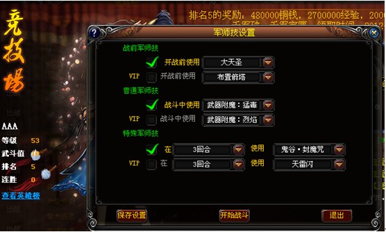 在竞技场面板中,你可以查阅到:基本个人信息、你的排名、奖励、可挑战对手、最近几次竞技场的战斗信息和相关战报、英雄榜等,并可以在该面板中进行一些相关操作。玩家可以通过点击可挑战对手的头像来进行挑战,点击头像后,将出现将要开战的战前“军师技设置”,设置后即可开始战斗。
