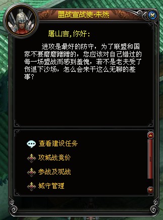 玩家可以到本国的任意城池的盟战管理员处报名攻打其他任意城池。