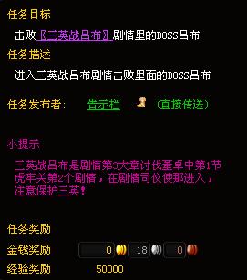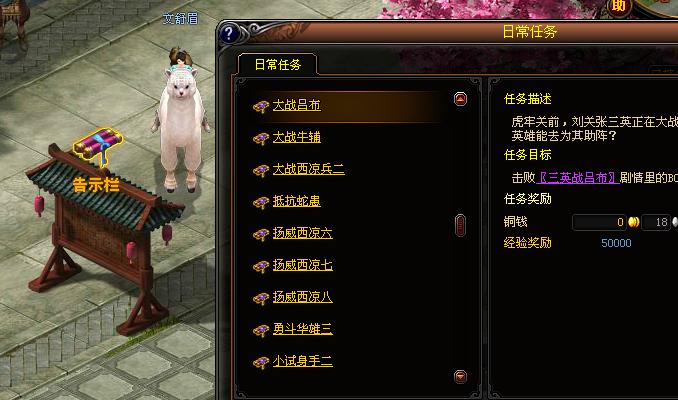 当今正值天下乱世,城市中的告示榜上每天都会贴出大量的任务,悬赏能人勇士为国家做贡献。日常任务的难度将根据玩家的等级自行调整,从20级开始,每10级提高一个档次。20级的任务只是最基本的操作任务,随着玩家等级的提高,任务的难度将会越来越大,奖励也会越来越丰厚,推荐玩家每日必做。