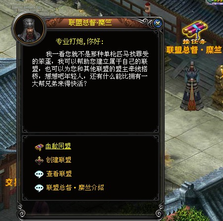 玩家到各城市的联盟管理员处可以选择建立联盟或者加入联盟。
