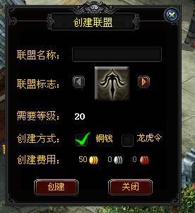 玩家等级到达20级,凑足50金后,就可以选择建立联盟了,也可以直接在道具商城购买龙虎令创建3级联盟。建立联盟时除了要输入联盟名字外,还需要选择一个联盟图标。