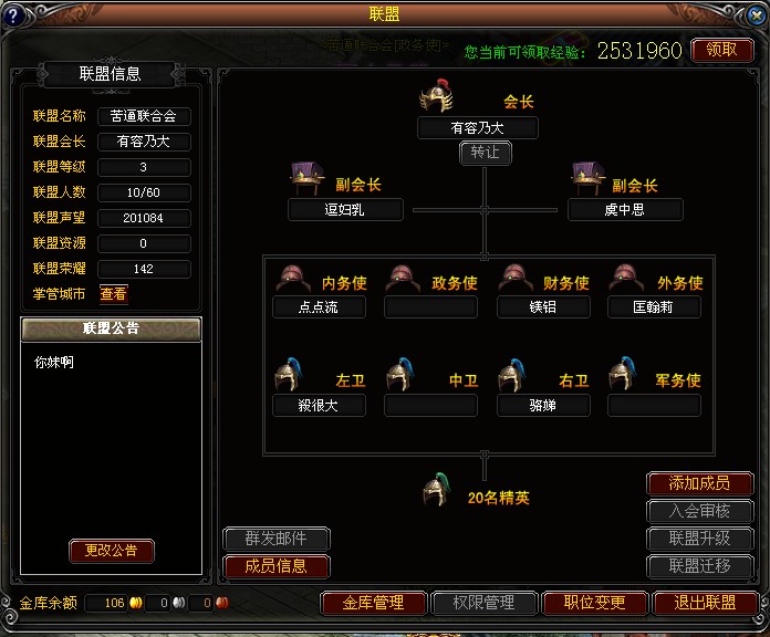 其中提升官职、降低官职、移出联盟需要一定的官职才可以进行。官职权限由会长在权限管理处管理。