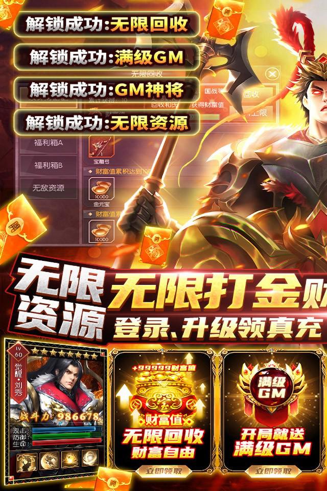 《国战来了》顶级团队耗时3年打造,传统三国策略大作,给玩家还原最真实的三国武将,体验最真实的三国。上线就解锁满级GM、解锁无限回收、解锁GM工具、解锁神将神装。 在游戏中,你将置身于三国战场,发展势力,招募良将,和盟友一起争夺洛阳!不需要担心土豪大佬碾压全服,游戏内剿灭土匪刷充无限爆,充值卡还可激活所有累充类型的-活动。杜绝“鬼服”“村服”,游戏中的赛季制“天下布武”玩法让玩家不再孤单。策划承诺,将虚心听取玩家意见,游戏版本内容持续更新!力求为玩家打造一款福利真实,有趣耐玩的正统三国策略手游!