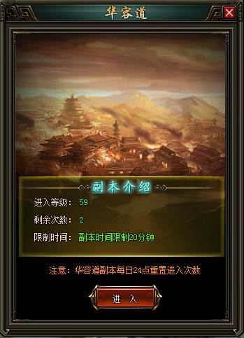 每日进入华容道副本的次数为2次,在20分钟内击杀所有关卡怪物才可获得通关大奖哦。