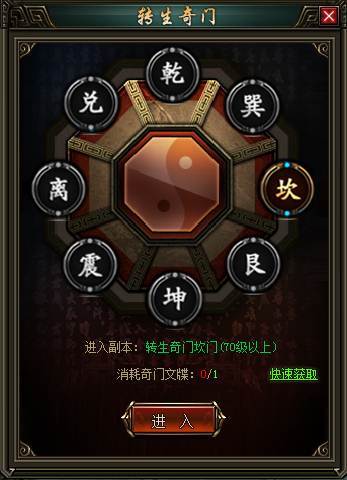 转生奇门分为7层,不同转生等级可进入对应的转生奇门地图,进入需要消耗奇门文牒。击杀转生奇门BOSS可获得极品装备。