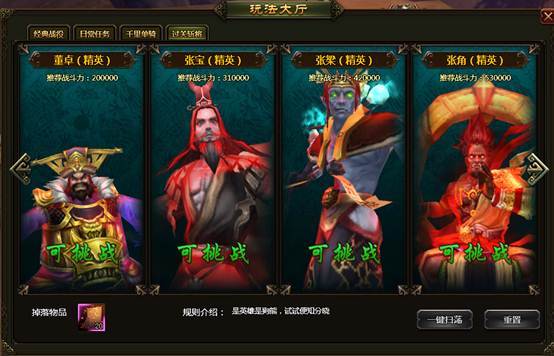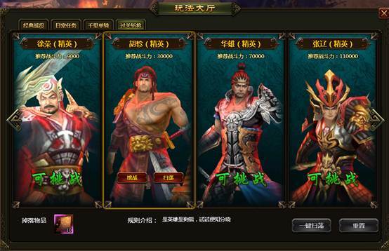 1、 共有8位三国时期精英,分别为徐荣、胡轸 [zhěn] ,华雄,张辽,董卓,张宝,张梁,张角。每个精英挑战成功后会给与奖励!