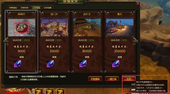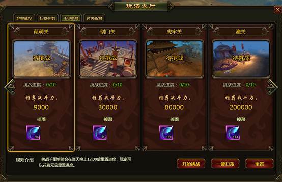 1、挑战千里单骑会在当天晚上12:00后重置进度,玩家可以花费元宝重置进度