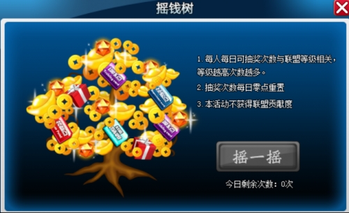 摇钱树板块中,联盟中的玩家每日可以进行一定次数的免费摇奖,次数和联盟的等级有关,每日零点重置次数~