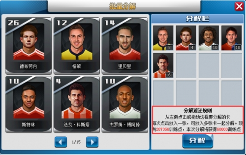 如果“卡片”界面中,有多组球星卡都没有用处,可以点击下方的批量分解按钮,对多组球星卡进行批量快捷的分解操作,操作的同时,下方还会出现本次分解可以获得的训练点数量的提示