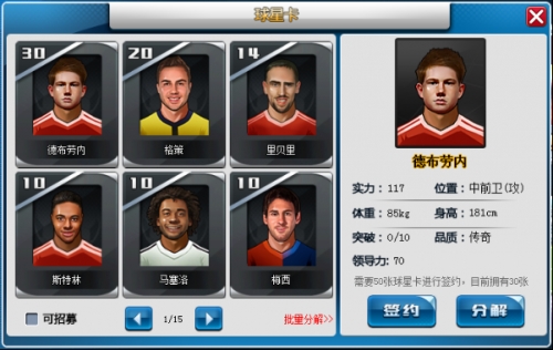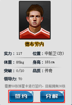 在选中某一组球星卡后,可以在通过右侧的签约按钮,将此组球星卡签约为球员,签约后的球员会出现在球队的替补阵容中,不要忘记更换阵容哈~如果认为此组球星卡没有用处,也可以点击右侧的分解按钮,将此组球星卡分解为训练点