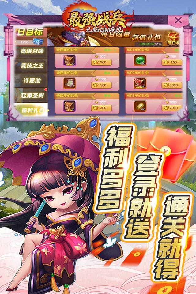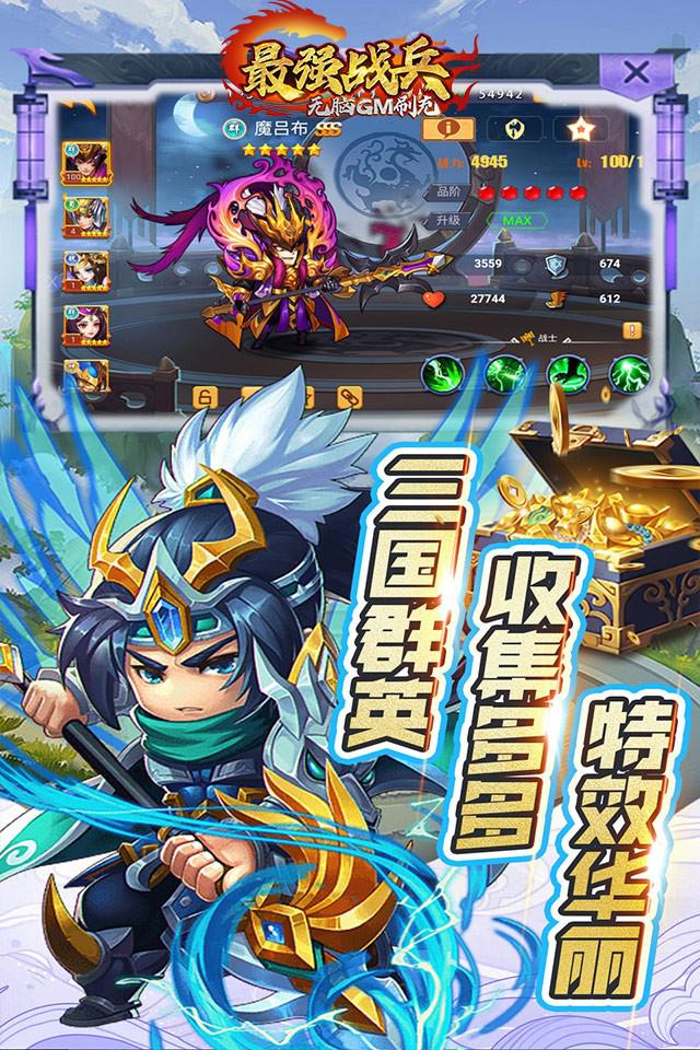 《最强战兵(无脑GM刷充)》以中国三国时期相关故事为背景,有清晰完整的故事背景和人物关系,有适量基于历史事件的改编,但不会与现实生活相混淆。游戏画面丰富美好,色彩鲜明,有一定难度的思维判断,鼓励玩家通过思考策略达成目标。