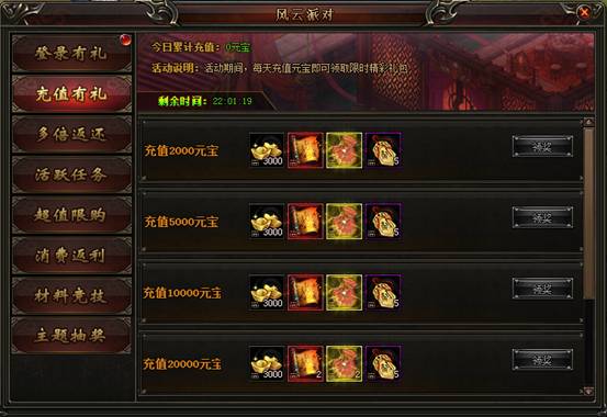 2. 充值有礼:活动期间,每天充值元宝可以获得对应充值量的奖励,有高阶八卦和藏宝图赠送。