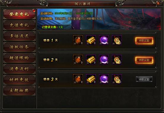 1. 登录有礼:活动期间内,每天登录游戏都可以免费领取奖励。