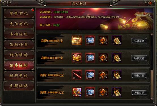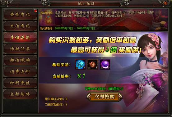 3. 多倍反还:活动期间,每天花费888元宝可购买超值材料,每日限购一次,购买的次数越多,奖励的倍率越高。