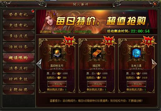 5. 超值限购:活动期间,每日会有特价商品登场,折扣力度极大,玩家可以轻松提升自身实力。