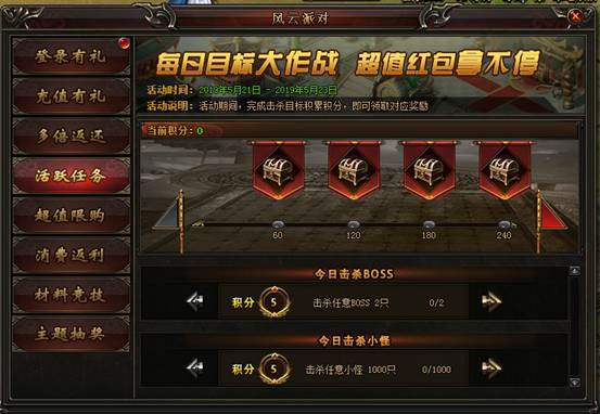 4. 活跃任务:每天完成目标任务可积累积分,积分达到要求值后,可以免费领取大量奖励。