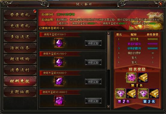 7. 材料竞技:活动期间内,使用木玺碎片达到一定数额可免费获得稀有宝石回馈,排名靠前的玩家还可获得额外高阶稀有宝石。