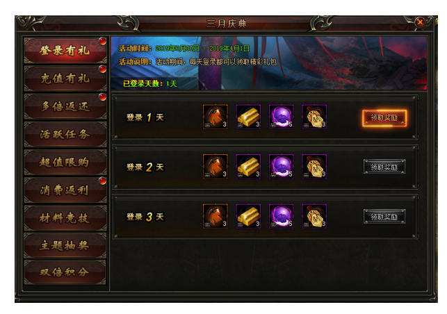 1. 登录有礼:活动期间内,每天登录游戏都可以免费领取奖励。