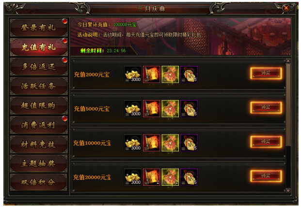 2. 充值有礼:活动期间,每天充值元宝可以获得对应充值量的奖励,有高阶八卦和藏宝图赠送。