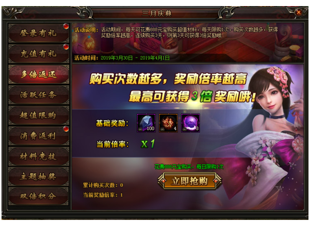 3. 多倍反还:活动期间,每天花费888元宝可购买超值材料,每日限购一次,购买的次数越多,奖励的倍率越高。