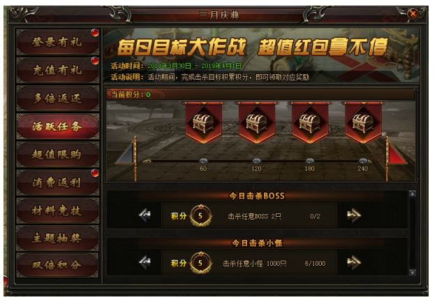 4. 活跃任务:每天完成目标任务可积累积分,积分达到要求值后,可以免费领取大量奖励。