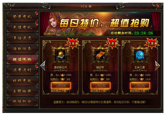 5. 超值限购:活动期间,每日会有特价商品登场,折扣力度极大,玩家可以轻松提升自身实力。