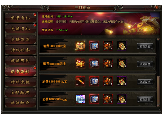 6. 消费返利:活动期间,累计消费元宝即可领龙神宝箱和神威三界装备,更有时装/特戒,超级称号赠送。