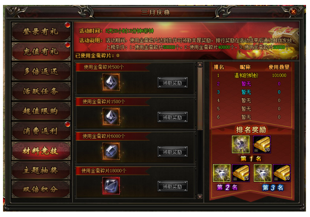 7. 材料竞技:活动期间内,使用金蚕碎片达到一定数额可免费获得稀有宝石反还,排名靠前的玩家还可获得额外高级稀有宝石。