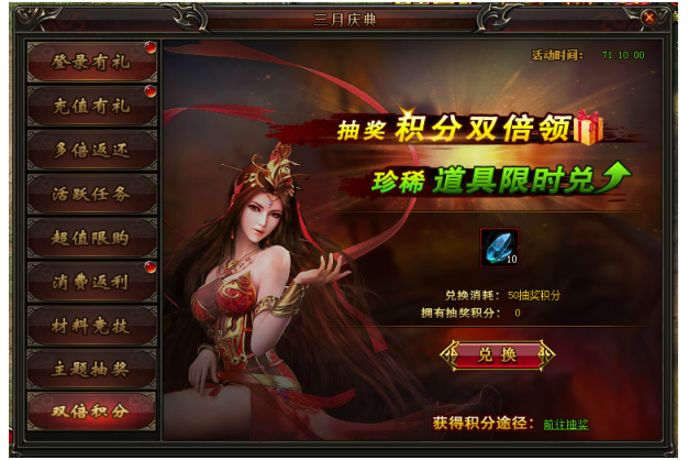 9. 双倍积分:活动期间抽奖可获得双倍抽奖积分,并限时开放抽奖积分兑换三界玄晶活动。