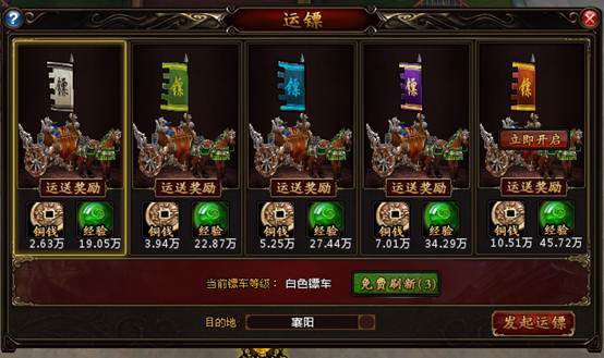 1.1、玩家每次接镖时,都可对镖车进行刷新,有几率获得更高品质的镖车,镖车一共有5种品质,品质越高奖励越多。