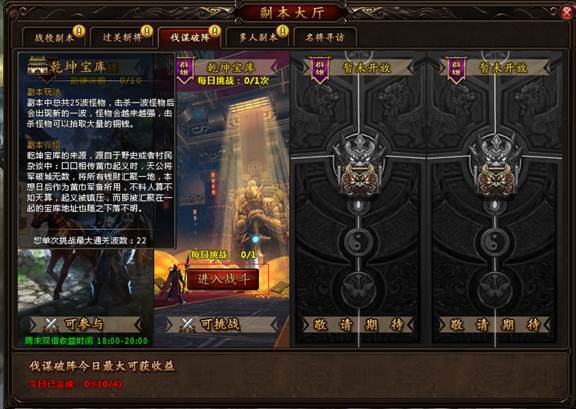 在副本大厅面板的“伐谋破阵”标签页下,当鼠标悬停“乾坤宝库”窗口会出现“进入战斗”的按钮:
