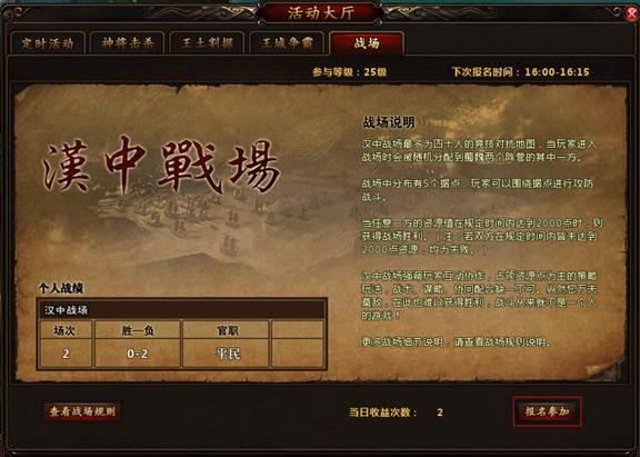 活动开启时,玩家点击“报名参加”按钮,开始报名战场活动;此时右上角会出现报名图标
