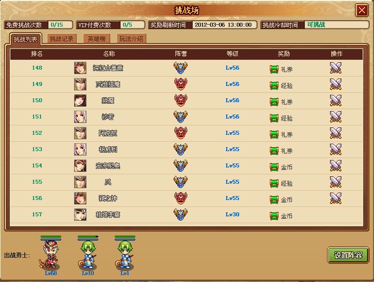 6.英雄榜:英雄榜刊登挑战场前10名的玩家信息。