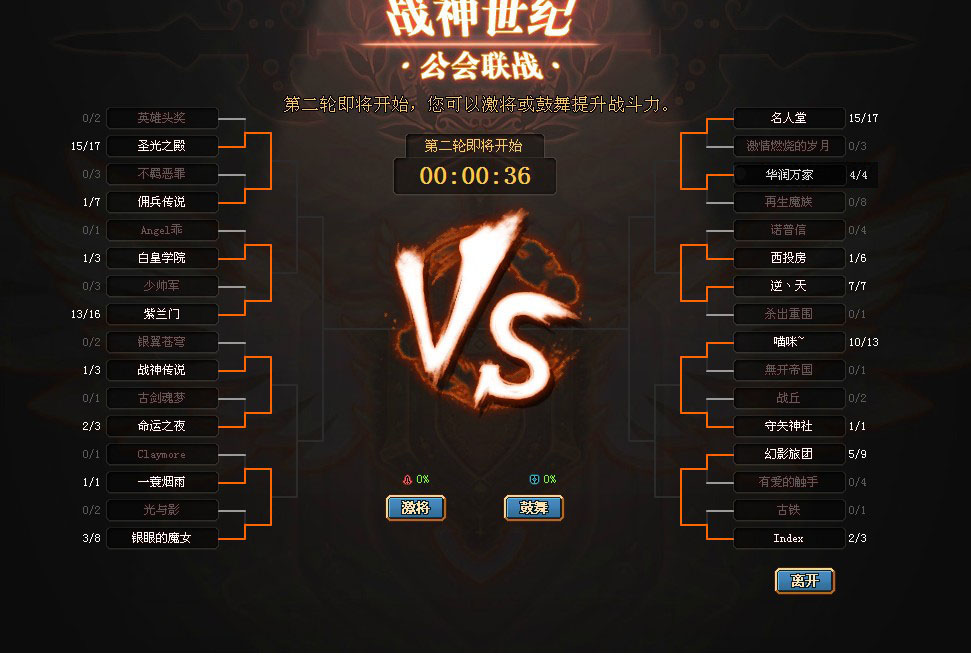 公会联战左侧为联盟的16强公会,右侧为帝国的16强公会,中间时间窗口显示战斗状态和时间,VS下方是激将和鼓舞功能按钮,点击使用可以增加攻击力和防御力。