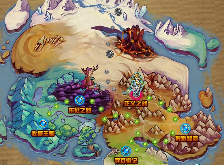 世界地图为游戏总地图,由七个章节模块构成,分别为收复王都、东征之路、寻觅徽记、解救盟友、正义之战、铲除魔王、极寒之地。玩家每通关一个章节会开放下一个章节地图。在世界地图中我们可以看到紫色亮点,而且上面有角色图标,这个就是角色当前所在的地图位置。除了紫色亮点,我们还可以看到蓝色亮点,这些蓝色亮点则代表游戏中已开放的地图,即玩家通过的章节;灰色点是暂未开放的地图,即玩家还没有通关的章节。