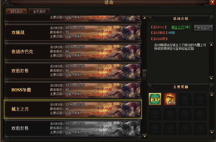 1.每天11:40-12:00、14:40-15:00、22:40-23:00分,玩家可以在土城参加城主之刃活动。