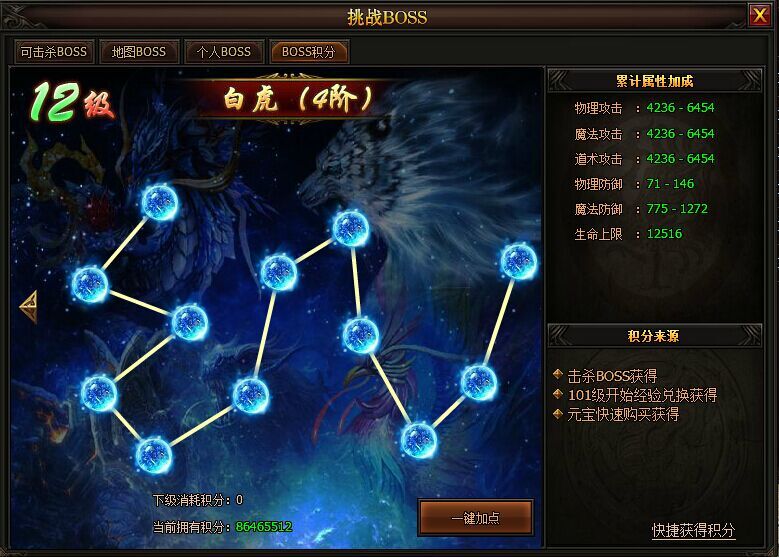至于BOSS积分,可以通过平时打BOSS和在线的时候累积增加,或者可以101级之后花费人物经验来兑换,直接元宝购买的话,因为属性提升不是很多性价比不算太高所以不推荐;功勋称号也是如此,可以通过每日的功勋除魔,不用怎么花费元宝就可以获得不少的功勋,所以这两样不用急着去升,如果你是大R超R不缺钱的话就不用考虑这些了,直接买买买,点点点就是了。
