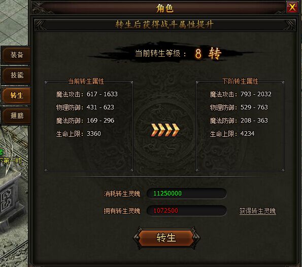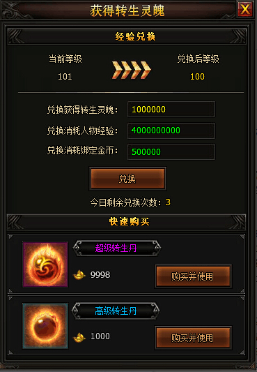 上面说明了转生的重要性,现在说一下转生的条件:转生需要花费大量的修为,修为最主要的获得途径是商城购买转生丹,其中高级转生丹每颗1000元宝,增加50000修为,每天只能使用20次,超级转生丹价格为9998元宝,增加500000修为,每天最多可以使用十次,其次就是用经验兑换修为了,每天可以花费大量的经验和铜币来兑换一些修为,每天最多兑换三次,前期大R的话不推荐这样,因为会将降低等级,从而与别人拉开差距,后期提升等级可以解锁更高的神炉等级上限,所以等级还是很有用的,不过购买转生丹的价格比较贵,小R和中R们有时间的话可以考虑使用经验来兑换转生修为。