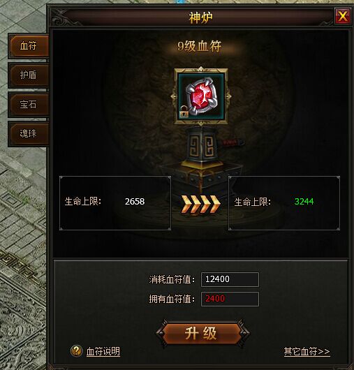 然后推荐大家提升神炉里面的宝石等级,宝石可以大幅度地提高人物的攻击力,宝石碎片可以通过打BOSS掉落,也可以从一些活动里面获得,比如每日的充值活动,还有VIP的等级奖励,其次的就是魂珠了,魂珠主要提高人物的暴击率和暴击伤害,是PK的时候想爽快地秒人的首选属性,魂珠主要获得途径跟宝石差不多,都是参加活动或者商城购买,剩余的护盾跟血符因为无法直接使用元宝购买的,所以先不急着提升,护盾的话每天通过材料副本镇魔宫殿的双倍奖励就可以获得比较多的了,血符可以通过平时的挂机打怪慢慢累积。