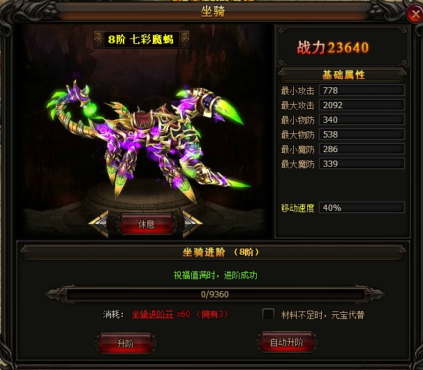 升级坐骑有一定成功几率哦!万一脸黑失败了不要紧,失败的话系统会自动为玩家累计祝福值,祝福值越高升级坐骑的成功率越大。