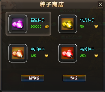 浇水:点击浇水,将所有已种了种子的土地全部浇水,加快种子1个小时的生长时间,根据种子品质不同消耗体力不同,普通种子每块地消耗5体力,其余种子每块地消耗10体力;