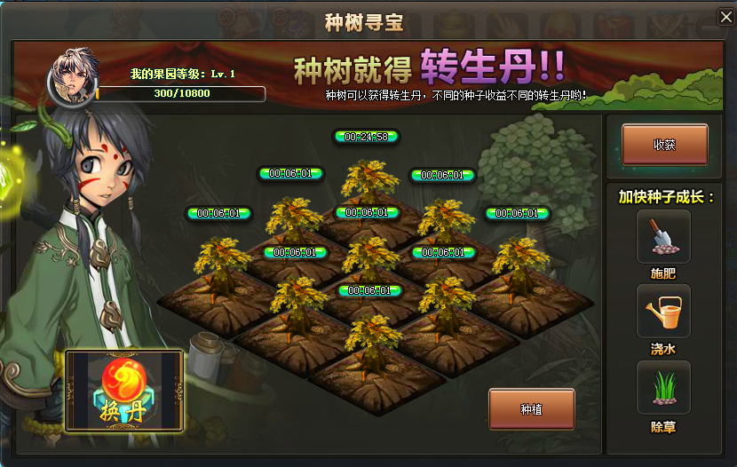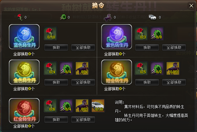 玩家可以通过种树获得材料,材料集齐到指定数量,即可在界面上去换取转生丹