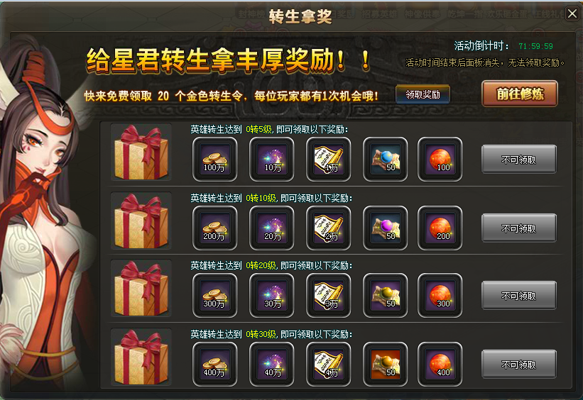 活动时间:玩家达到70级开启【武将转生】功能之后活动自动开启,持续72小时;
