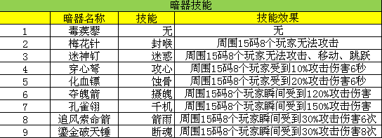 顶级封喉秘籍:江湖中流传的暗器绝学,使用后可增加暗器附加属性 攻击+1500,并将暗器技能“封喉”进行升级,升级为独立触发技能,升级后的技能攻击目标时,技能触发率 +10%,需暗器达到索命箭及以上暗器时才可使用。