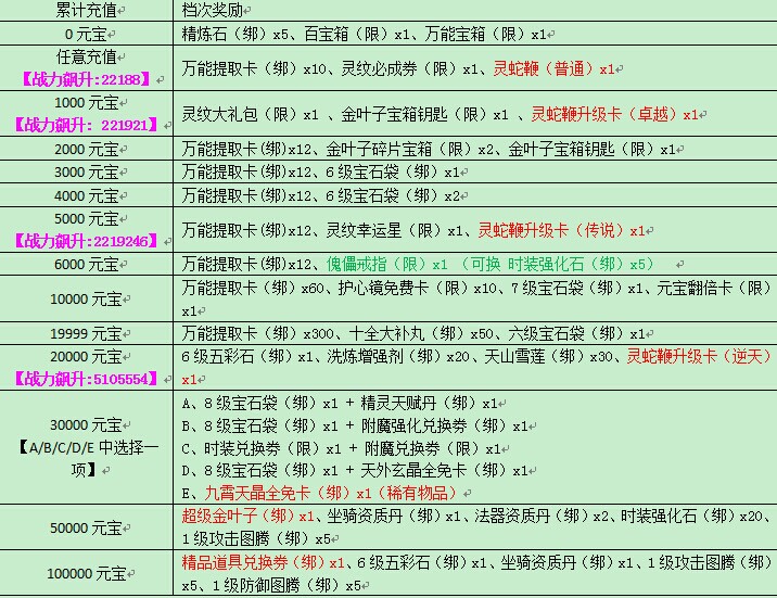 奖励一、活动期间,玩家累计充值达到相应条件,即可到右上角 限时活动 界面 领取大量超值好礼,具体档次奖励如下: